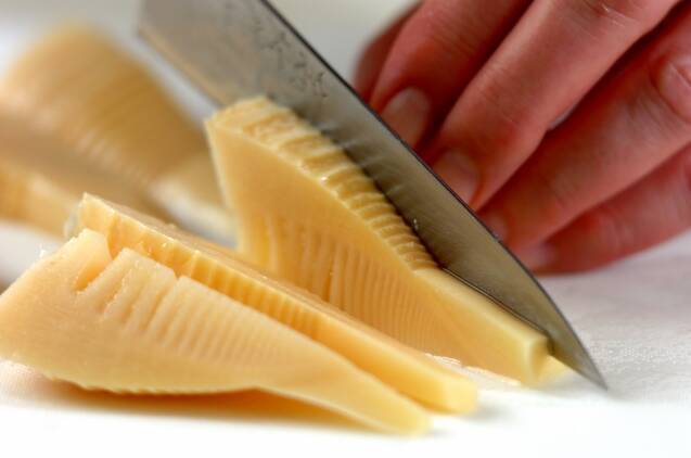 生タケノコはゆでておく。タケノコは縦8等分に切る。ボウルで<つくねタネ>の材料を練り混ぜ、8等分にする。<調味料>の材料を混ぜておく。