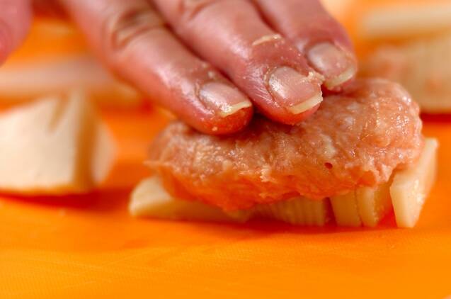タケノコの片面に片栗粉をつけ、<つくねタネ>を軽く押し付ける。