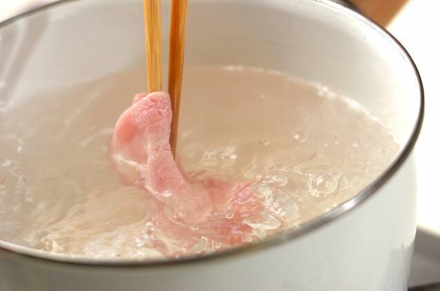 豚肉をたっぷりの熱湯に1枚ずつ入れて火が通ったら水に取り、ザルに上げて水気をきる。