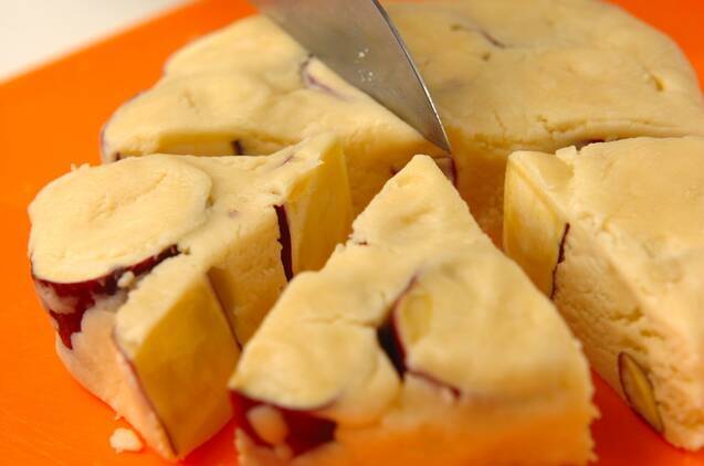 (2)にサツマイモを加え、ひとまとまりになるまで混ぜ、厚さ3cmの円状に伸ばして6等分に切る。