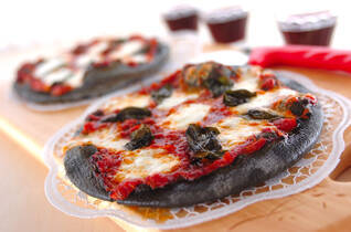 真っ黒なピザ生地にトマトソースモッツアレラチーズ、バジルをトッピング。トッピングはシンプルだけれど、真っ黒な生地でインパクト大!