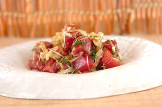 味付けがとってもシンプルだから、それぞれの素材の味がひきたちます。キリッと冷やしたお酒と一緒にぜひ!ヨコワの代わりにカツオでもおいしいですよ!