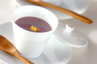 紫イモパウダーを使った、いつもとはひと味違うスープ。金箔でちょっと豪華に♪