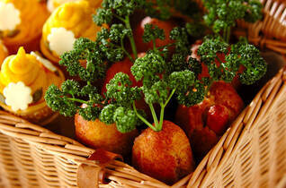 ホットケーキミックスの生地でソーセージを包んで子供の好きな味に。盛り付けはパセリを使ってニンジンに可愛く変身!!