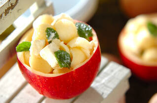 くり抜いたリンゴを器にして、見た目も可愛いデザートに。メープルとクリームチーズの組み合わせは絶品!