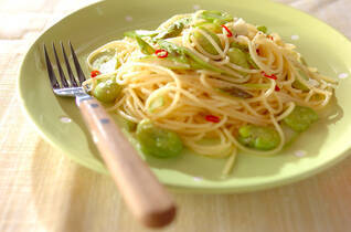 アスパラとソラ豆のグリーン色がとってもきれいな春色パスタ。素材がシンプルな分、最後の塩コショウは慎重に!