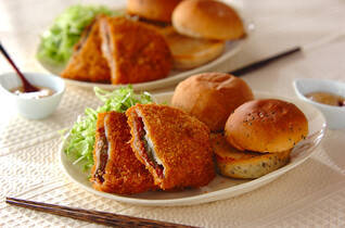 今回はバーガー用バンズを合わせました。バンズの厚みを半分に切って軽くトーストし、野菜、和風トンカツ、野菜の順にのせ、<ソース>をかけてサンドしたらバーガーの完成!