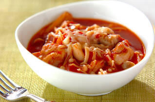 チキンとキノコを炒めて5分煮るだけで、じっくり煮込んだような深い味わいに。