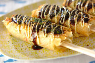 お好み焼きの生地に素麺を入れると、もちもち食感に!クルクル巻くのが楽しいね!