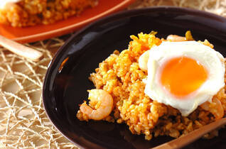 インドネシア風炒飯。豆板醤を加えてピリ辛に。むきエビは炊き上がってから加えることで硬くなるのを防ぎます。