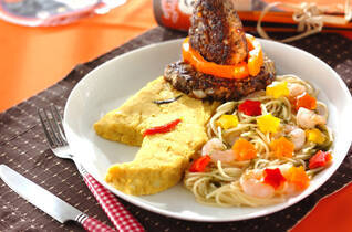 マッシュポテト、スパゲッティ、ハンバーグ、みんなの好きなものが大集合!帽子の立体感で存在感のある魔女の登場。