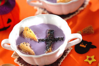 玉ネギ、紫イモを炒めるときに塩を加えることで、早くしんなりと炒まります。紫イモがなければ、カボチャで黄色いポタージュにしても。