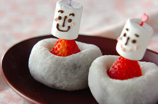 市販の大福餅とマシュマロを組み合わせてかわいらしいおひな様の形にアレンジしてみました。小さいお子様とも簡単に楽しんで作れるようになっています。