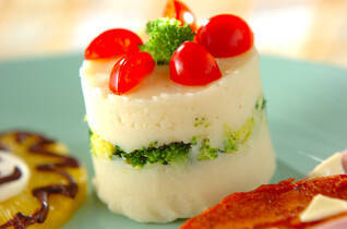 お手軽なマッシュポテトの素を使って、見た目も華やかなケーキの形に仕上げます。