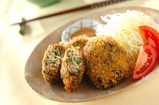 餃子の具をハンバーグ状にまとめ、パン粉をつけて揚げるボリューム満点な一品。揚げたてを召し上がれ。