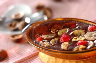 フルーツやナッツが入ったアツアツのスイーツグラタンで、彼と一緒にアツアツなバレンタインを♪火が通りやすいよう浅い器で焼くのがおすすめ。