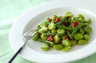 旨みがギュッと凝縮されたドライトマトをまとった、ホクホクのソラ豆を味わいます。