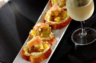 焼きナスとパイナップルを合わせ、生ハムものせたひと口で色々な味を楽しめるブルスケッタ。ワインがすすみます。
