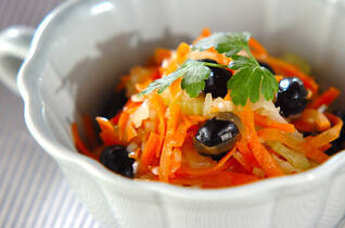 サッパリとしたマリネに甘い黒豆がアクセント。白と赤、黒……見た目もキレイな一皿です。