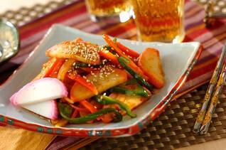 余ったカマボコがヘルシーなおつまみに。ピリ辛の味でビールが進みます。