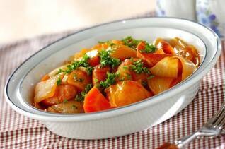 フライパンひとつで短時間で作れる豚ヒレ肉と根菜のトマト煮です。