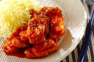 鶏むね肉をカラッと揚げてコチュジャンの入ったピリ辛マヨネーズソースで和えました。ボリュームのある節約レシピ。