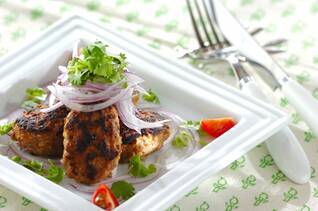 インドの人気料理ケバブをイメージしたスパイシーなアレンジハンバーグ。たっぷり香菜とオニオンスライスをのせて。