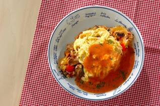 チキントマト煮の具をライスに、煮汁をソースに分けて使うのがコツ! 電子レンジとフライパンで簡単にできますよ。