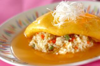 カニ缶を入れたオムレツをのせて。酢を効かせたあんをかけた中華風のオムライスです。