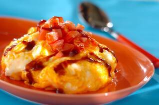 チリパウダーのピリッとした辛さと卵のまろやかさがよく合います。トマトをのせる事でサッパリおいしいオムライスが完成です!
