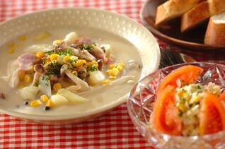 シチューは、バターを加えてコクをアップ! キャベツは、塩を振るひと手間でぐんと味がなじみます。
