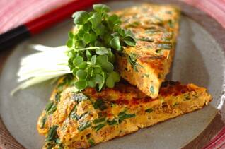 肉みそにしっかり味がついているので、混ぜて焼くだけで具だくさんオムレツに。