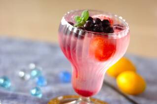 凍ったベリー類をたっぷりとのせたレモネード。溶けていくベリーがピンクから赤に変化していくのも楽しんで。