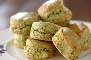 緑茶の葉を加えてほんのり香る和風のスコーン。和三盆でコクを出し、色付けで抹茶を少々加えるのがポイント。