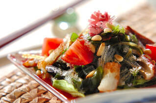ドレッシングにナンプラー、香菜が入るだけでアジアンな一皿に。しっかり焼き目をつけたちくわと、炒った松の実が香ばしいです。