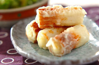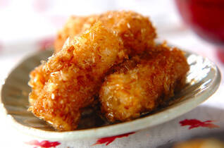 ちくわにかつお節をからめて、カリッと揚げました。かつお節の食感が新鮮。