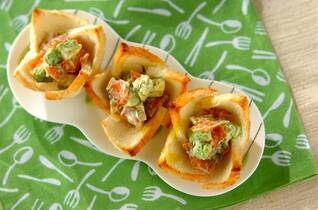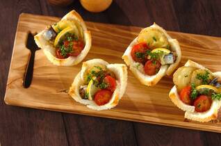 ホクホクのジャガイモにオイルサーディンを合わせた具材を食パンカップに詰めました。お酒にもよく合う大人向けの前菜です。