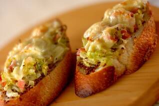 黒コショウが香る炒めキャベツをたっぷり挟んで、チーズをかけて焼きました。