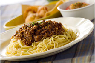 濃厚なミートソースとご飯の意外な組み合わせの丼です。温泉卵をからめて召し上がれ!