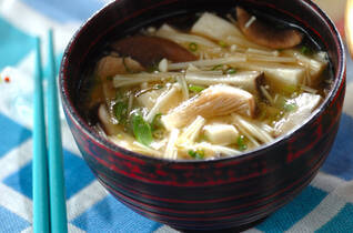 エリンギとエノキが入った、キノコたっぷりのみそ汁。最後に加えるゴマ油がポイント。