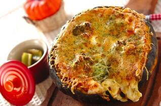 カボチャをくり抜いた器でつくるグラタンです。ハロウィンパーティーでも見栄えのする一品!