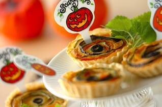 餃子の皮を使った、お手軽だけど持ち寄りパーティーにピッタリのミニサイズのキッシュ。ハロウィンにもおススメ!