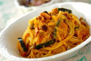 ハロウィンの夕食にピッタリ。牛乳+カボチャのソースはほんのり甘く優しい味わい。ベーコンやチーズの塩気がアクセントに。