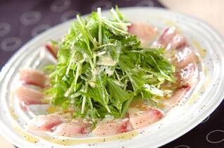 脂ののったブリにオリーブ油をまわしかけておしゃれな一皿に。