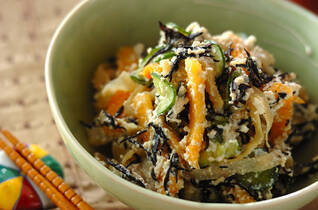 柿とヒジキの意外な組み合わせが病み付きになる味。塩クラゲの食感がアクセントに。