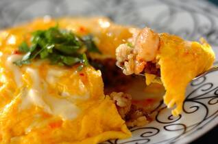 チリパウダーのピリッとした辛さと卵のまろやかさがよく合います。トマトをのせる事でサッパリおいしいオムライスが完成です!