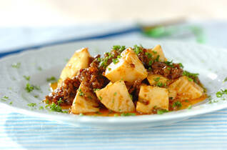 タケノコと合いびき肉を赤ワインやデミグラスソースで炒めた一品です。ビザ用チーズをのせてトースターで焼いてもおいしいですよ。