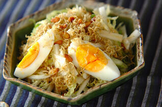 白菜に熱したゴマ油とカリカリジャコをジュワッとかけて。香りと音も楽しんで下さい。