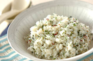 混ぜご飯のおにぎりをのりの代わりに大葉で巻いて。風味豊かなおにぎりです。