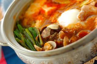 キムチとコチュジャンのピリ辛を温泉卵がまろやかに包んでくれるチゲ鍋に。